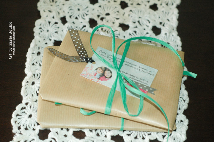 I printed these tags on photo paper since they were so small. I think I used the wrong paper though because the ink would no set so I ended up spraying them with a matte finish acrylic spray (since I bought a large pack of paper I will probably be doing this often!) I am also currently in love with washi tape so I used some on the bottom. I also added a ribbon and taped them to our packages. Pretty cute if you ask me.